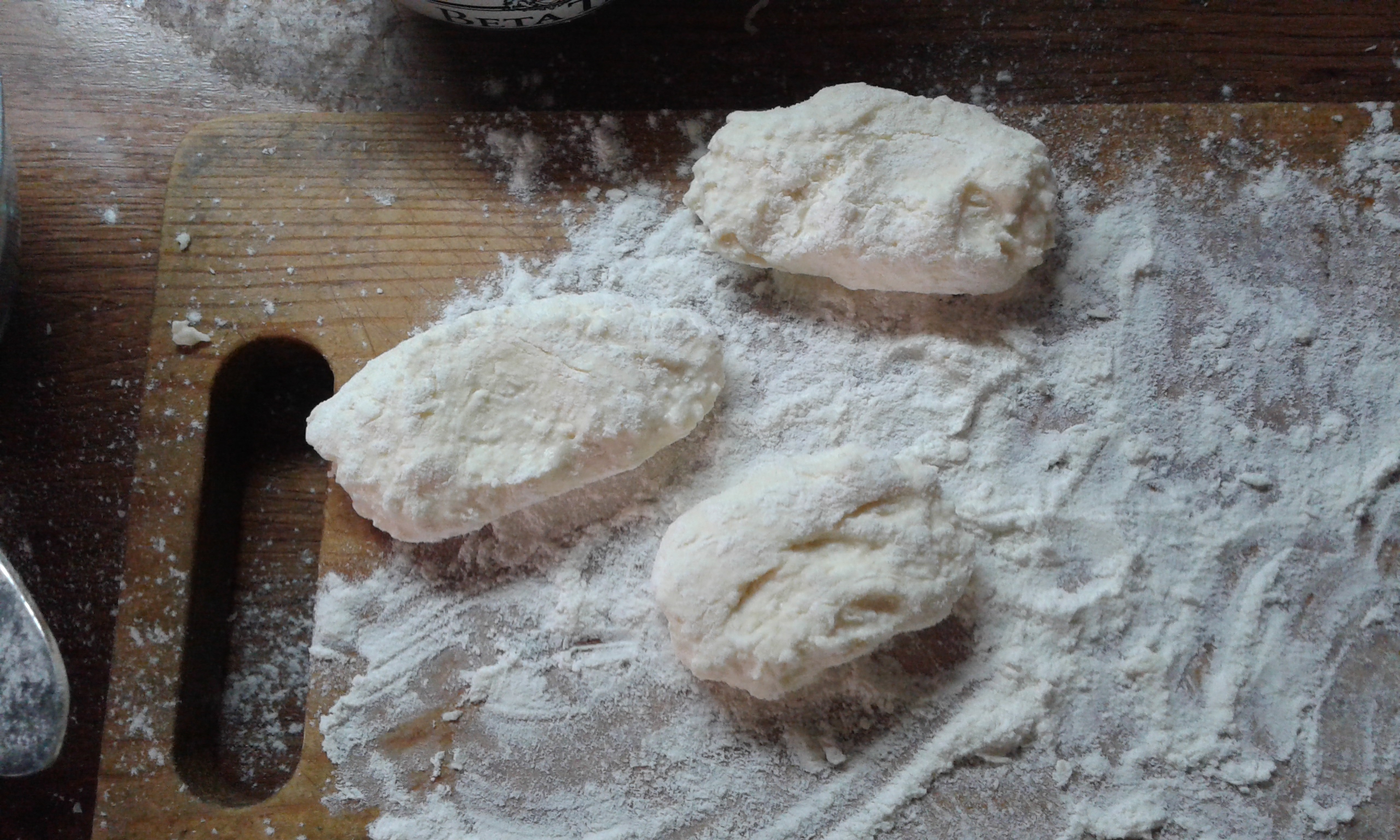 На доску насыпаем муку, и формируем колобочки, обваливая их