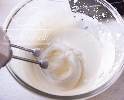 Белки взбиваем с оставшимся сахаром до мягких пиков.