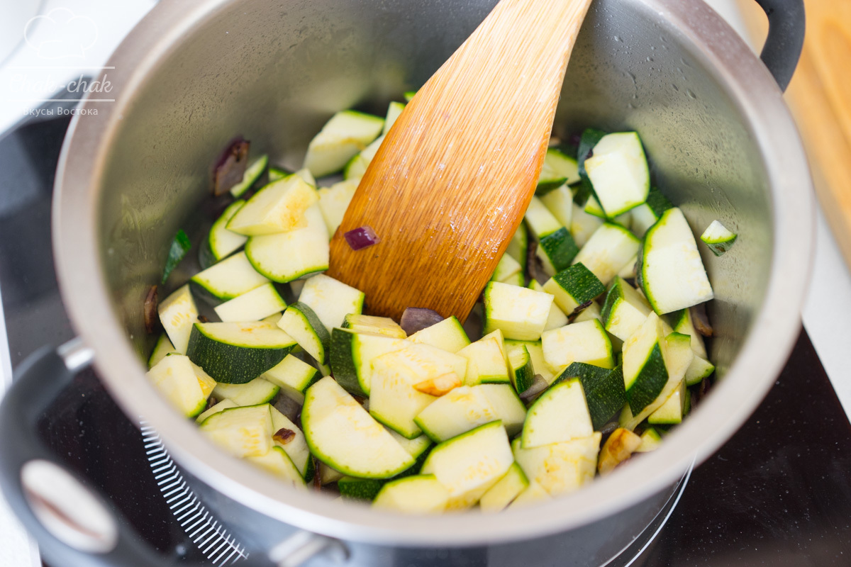 Как только кухню окутает аромат чеснока, добавьте два больших цукини, порезанных кубиком. Обжаривайте 5 минут, помешивая. Можно их заменить кабачками, но ни чем-то другим.