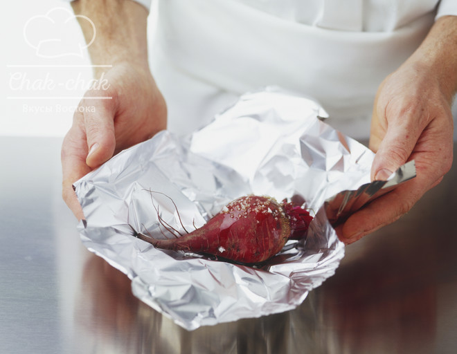 Второй способ – положить свеклу на лист фольги, сбрызнуть маслом и посыпать солью, плотно завернуть и отправить в разогретую до 180 градусов духовку на 40-60 минут. Чтобы свекла получилась ароматной, можно добавить к ней веточку розмарина или приправу.