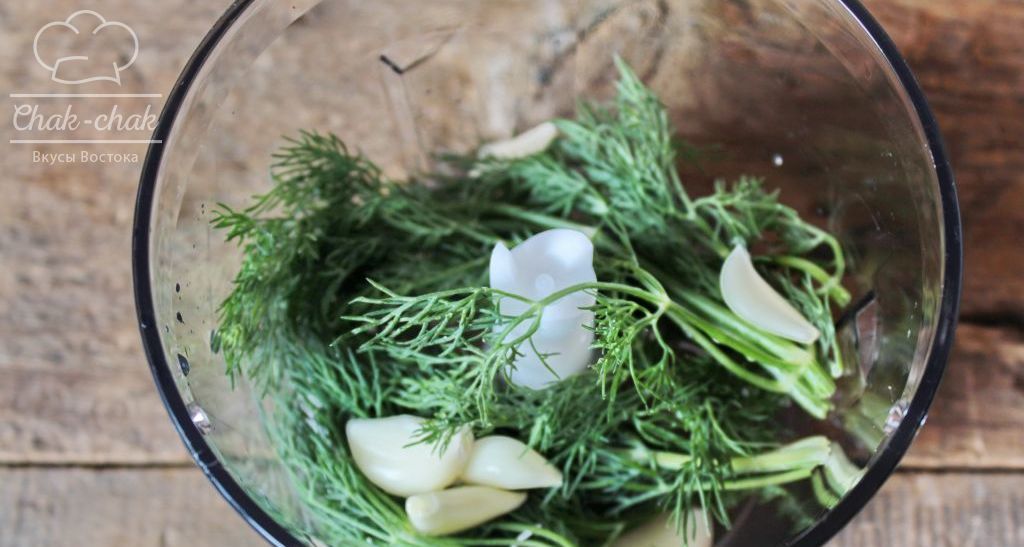 Кўкатлар тайёрланади: укроп баргларидан ажратилади, қалин шохчалари олиб ташланади, саримсоқ ҳам тозаланади.